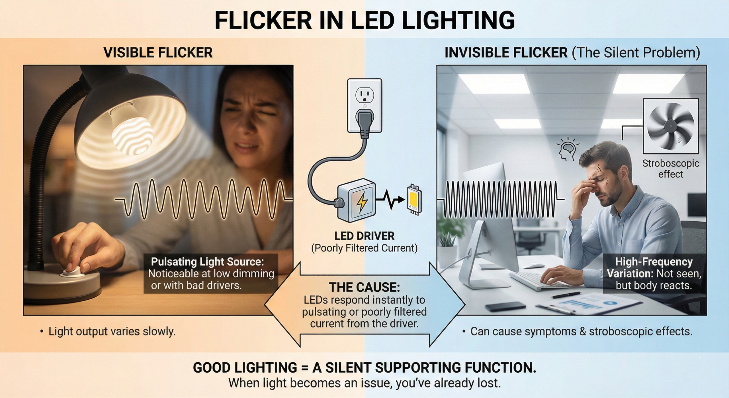 LED has practically won the lighting war. It is energy efficient, has a long lifespan and gives you flexibility in everything from offices to warehouses and shops. However, there is a classic trap that many people fall into: flicker. It is the type of “invisible irritation” that is not always detected in an inspection, but which becomes very visible when employees get headaches, get tired eyes or complain that they feel unwell under the light. In other words, LED flicker is not a cosmetic problem. It is a quality and HSE issue, and it affects both well-being and performance.