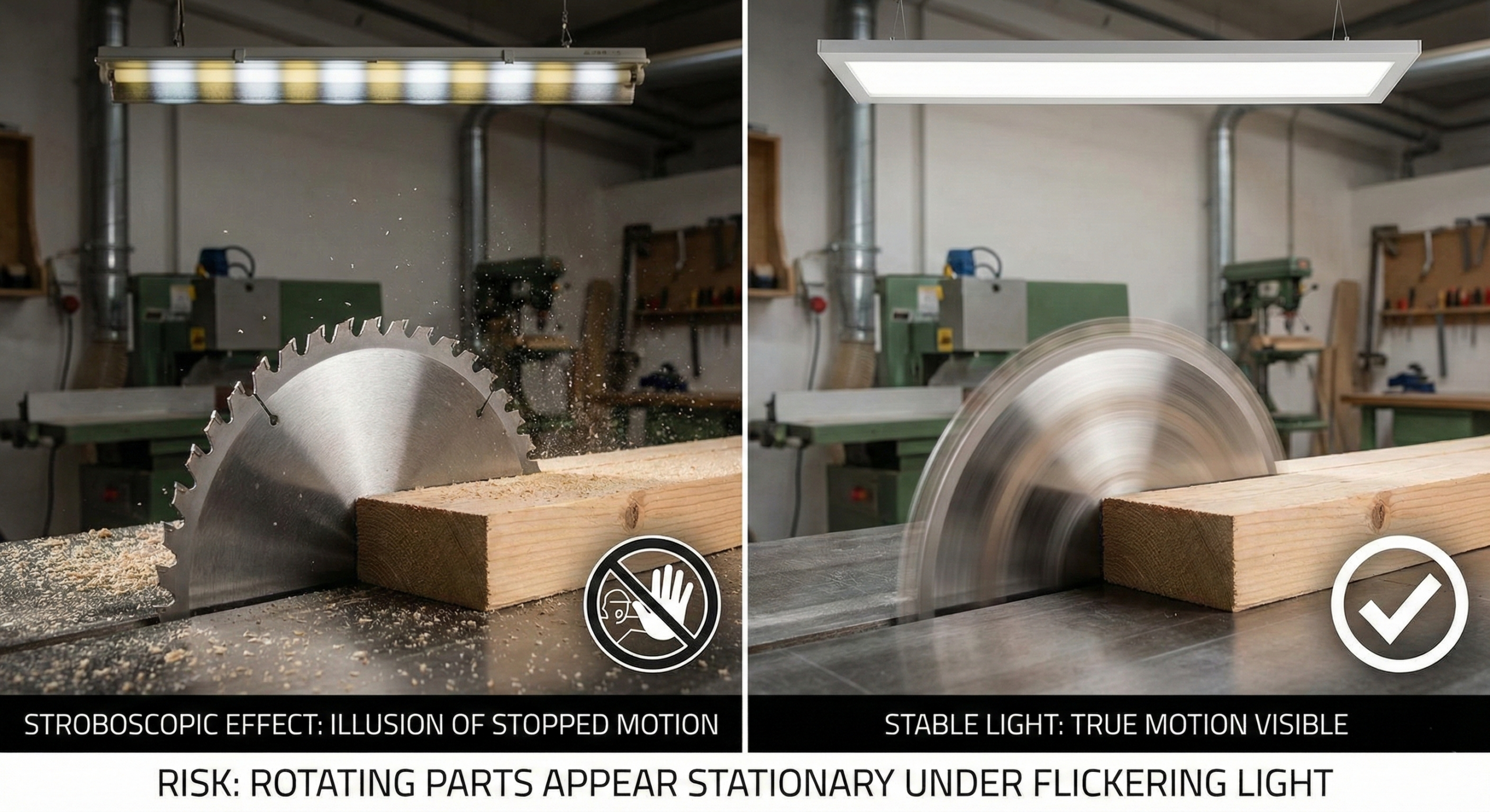 This is an underestimated risk. Flicker can create a stroboscopic effect , which makes rotating parts (fans, drills, saw blades, motor shafts) appear to be stationary, or running slower than they actually are. In industrial environments this is obviously critical, but also in workshops, warehouses and production lines it is a real HSE issue.