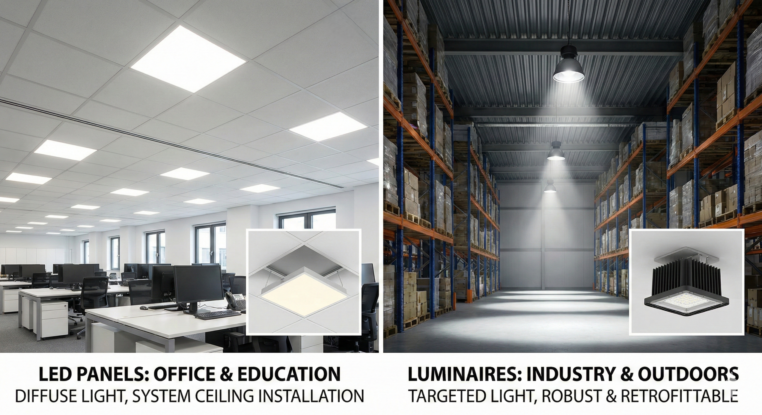 Application: Panels dominate in office and educational environments. Luminaires dominate in industry, warehouses, outdoors, wet rooms, and places with demanding environmental requirements. A rule of thumb: The more demanding the environment, the more likely that “classic luminaire” is correct.
