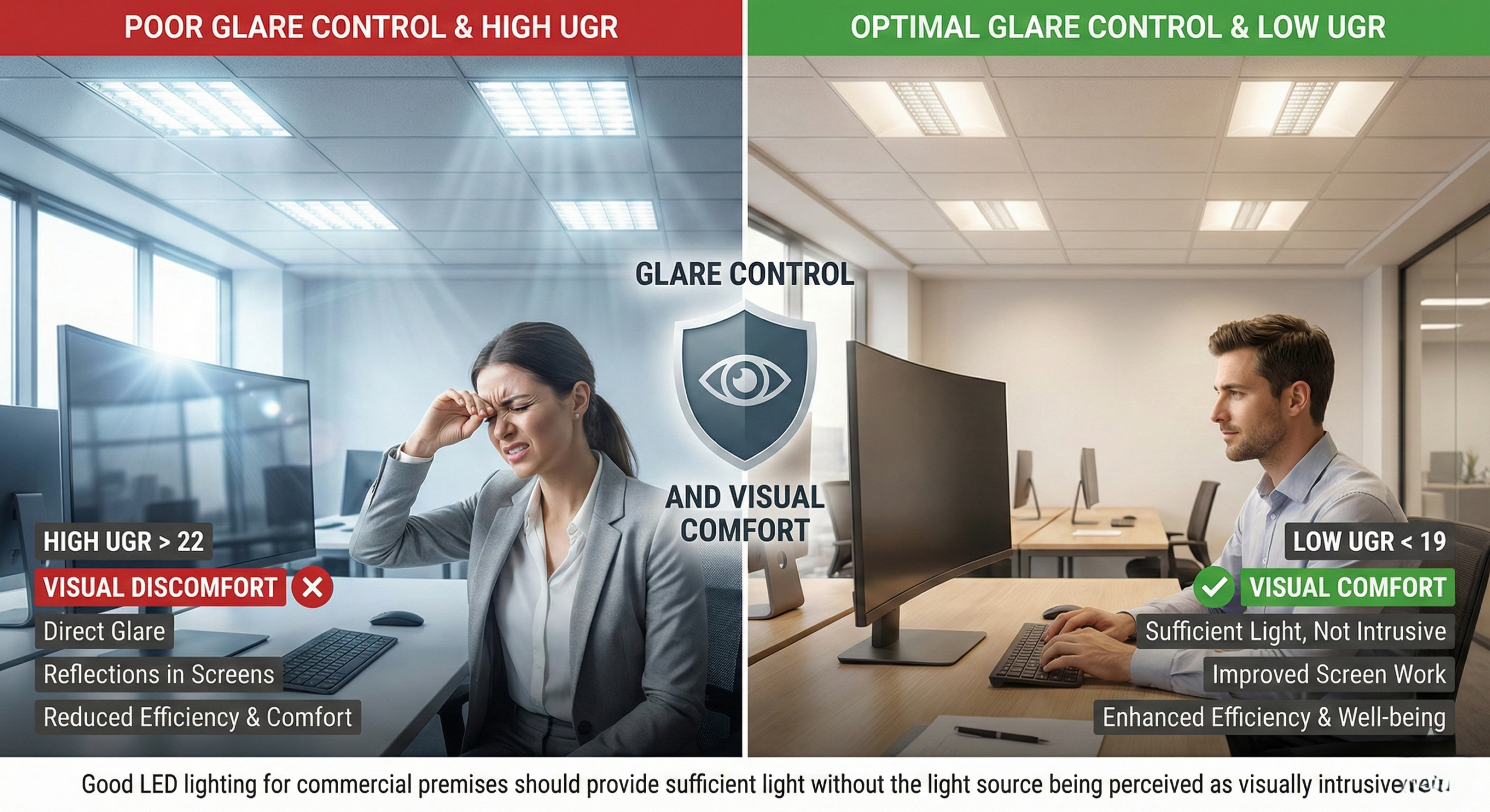 I kontorer og andre miljøer med skjermarbeid er en lav UGR-verdi essensiell. LED-armaturer med dårlig optikk kan forårsake direkte blending eller reflekser i skjermer, noe som reduserer komfort og effektivitet betydelig. Billige LED-paneler er ofte den største synderen her.