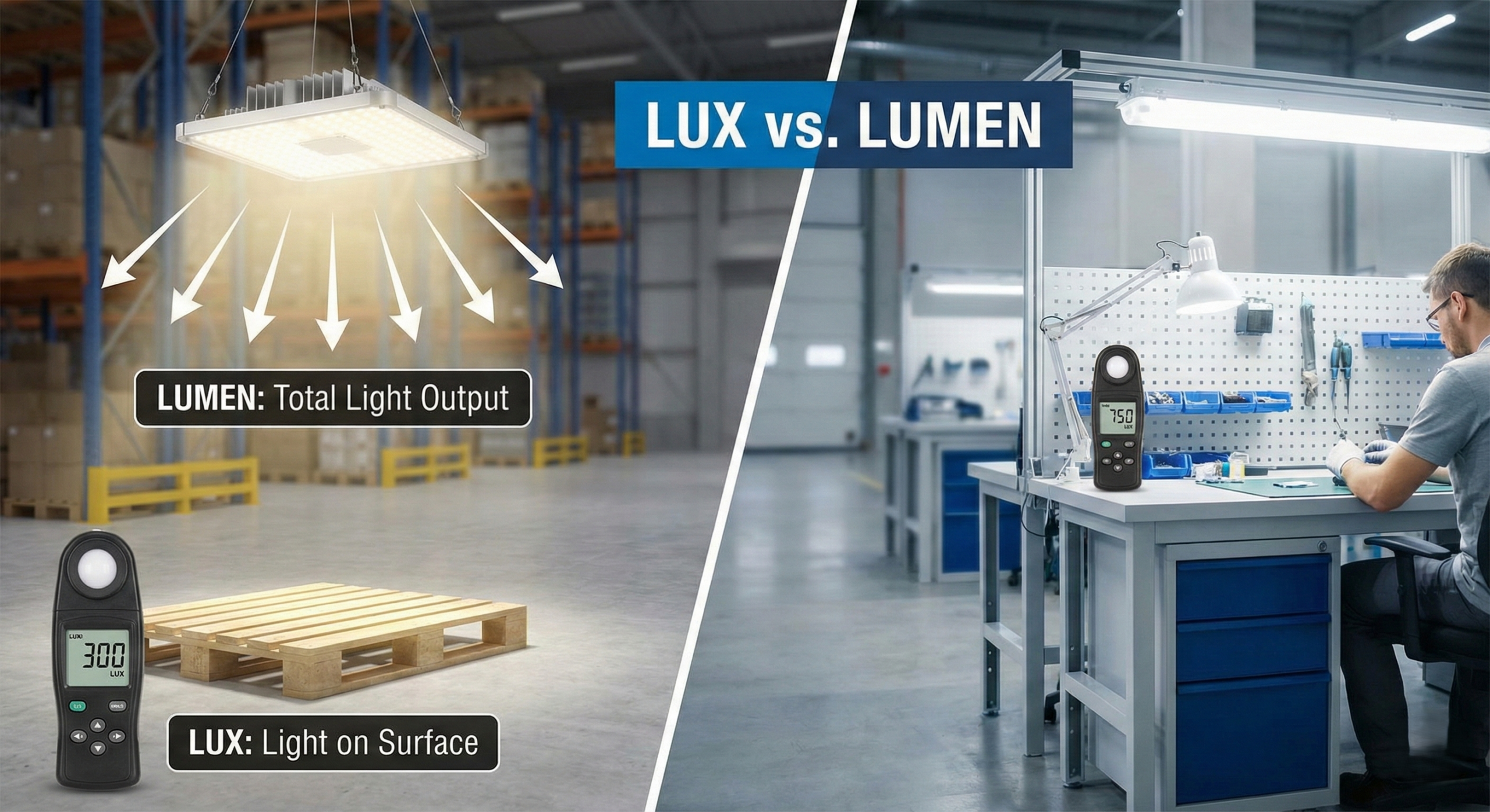 En av de vanligste feilene ved valg av LED-belysning for industri er å fokusere på lumen fremfor lux. Lumen beskriver hvor mye lys en armatur sender ut. Lux beskriver hvor mye lys som faktisk treffer arbeidsflaten. Det er lux som er relevant for mennesker og arbeidsoppgaver.