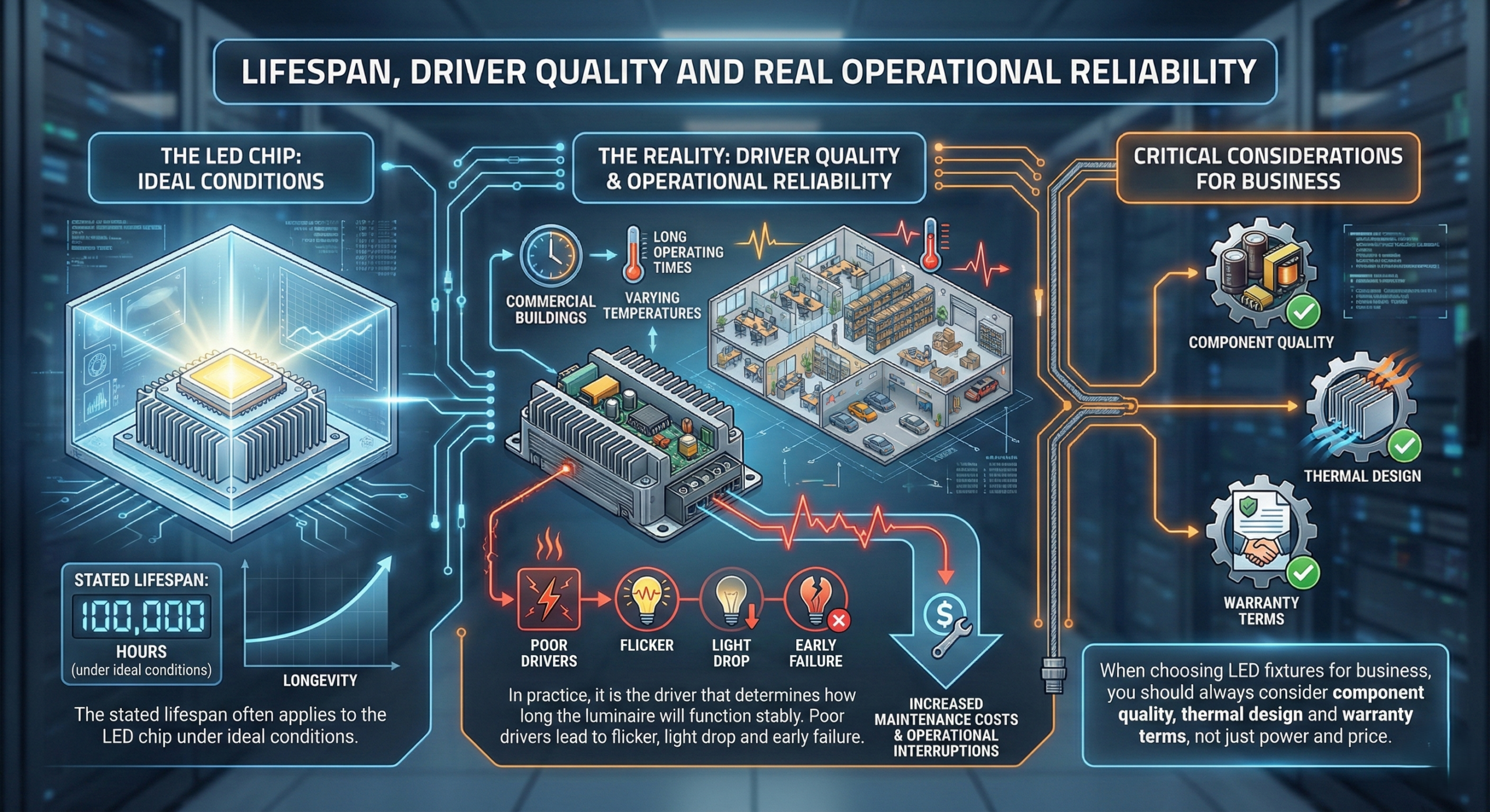 I næringsbygg med lang driftstid og varierende temperaturforhold stilles det høye krav til driverkvalitet. Dårlige drivere fører til flimring, redusert lysutbytte og tidlig svikt. Dette resulterer i både økte vedlikeholdskostnader og driftsavbrudd.